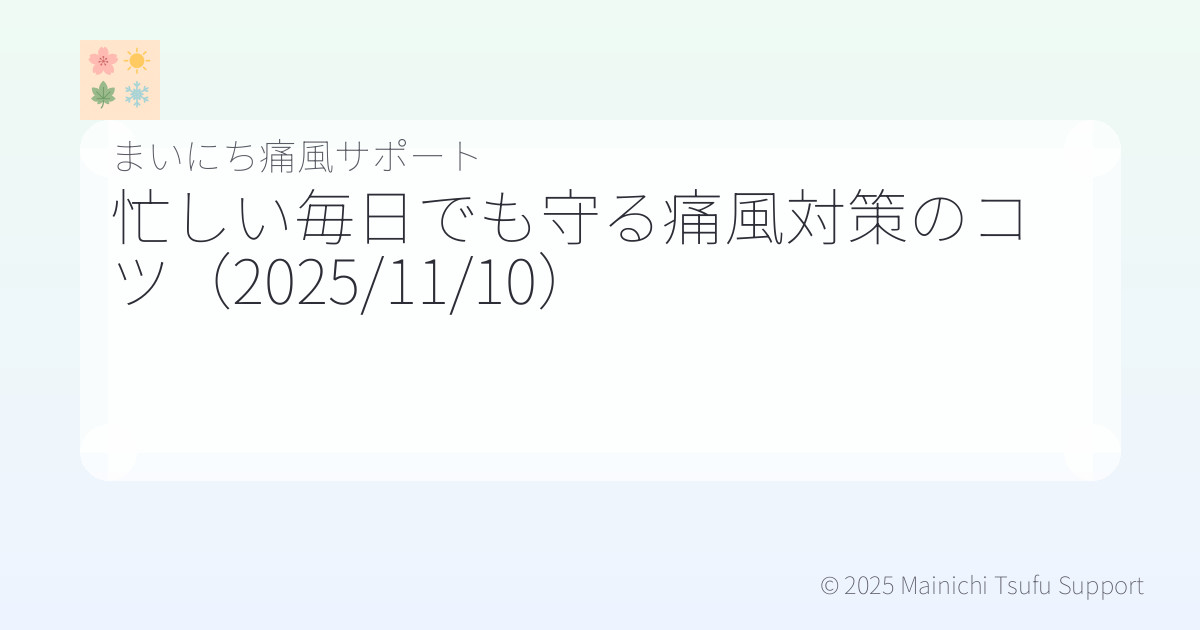 - ストレス管理:忙しい日々はストレスを生む原因となります。ストレスは痛風の発作を引き起こす要因の一つですので、リラックスできる時間を持つことが大切です。趣味や散歩など、心を落ち着ける時間を作りましょう。