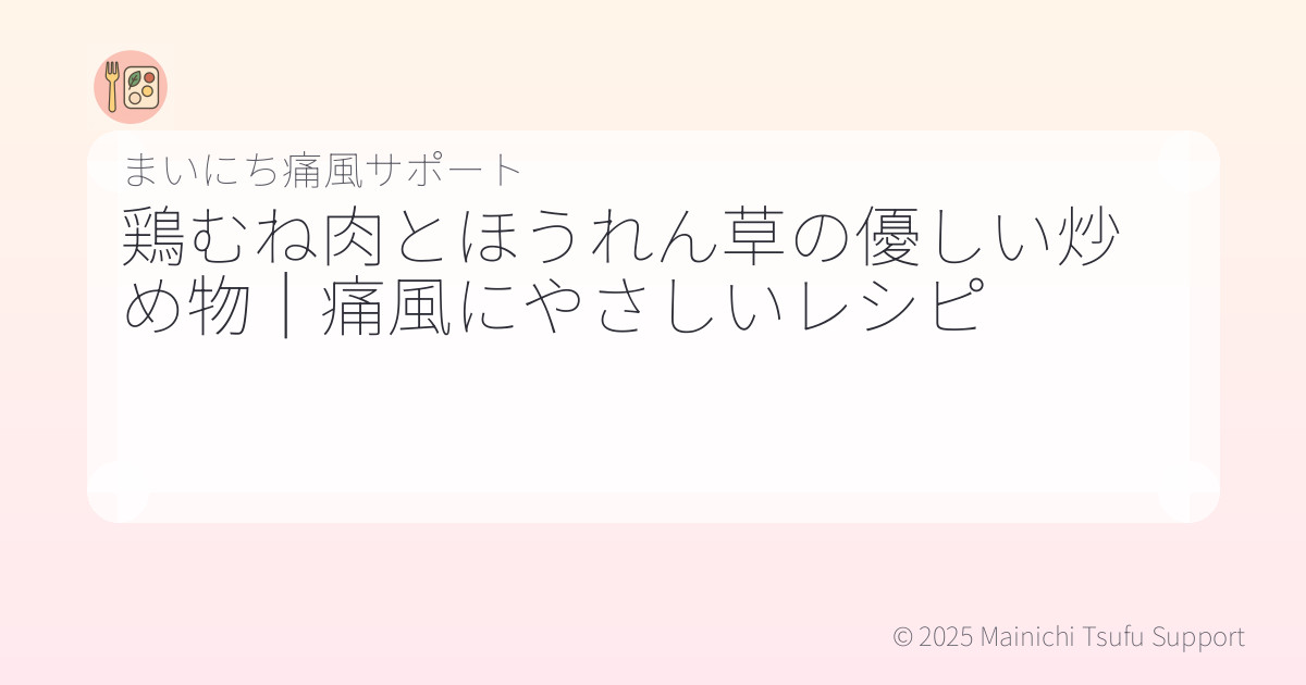 鶏むね肉とほうれん草は低プリン体の食材で、痛風に配慮したレシピです。鶏むね肉は高たんぱくでありながら、プリン体が少ないため、安心して食べられます。