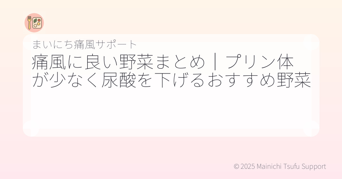痛風に良い野菜まとめ|プリン体が少なく尿酸を下げるおすすめ野菜 食事と痛風 2025/11/19 目次 はじめに■ 特におすすめの野菜・キャベツ・大根・きゅうり・トマト■ おすすめ食べ方 はじめに 野菜は痛風予防に非常に効果的です。プリン体が少なく、尿酸排出を助けるカリウムを豊富に含んでいます。 ■ 特におすすめの野菜 ・キャベツ 胃腸に優しく、カリウムが豊富。 ・大根 消化を助け、尿酸排出に有効。 ・きゅうり 水分が多く排尿を促進。 ・トマト リコピンが抗酸化作用を持ち、痛風にプラス。 ■ おすすめ食べ方 サラダ 温野菜 野菜の味噌汁 蒸し野菜