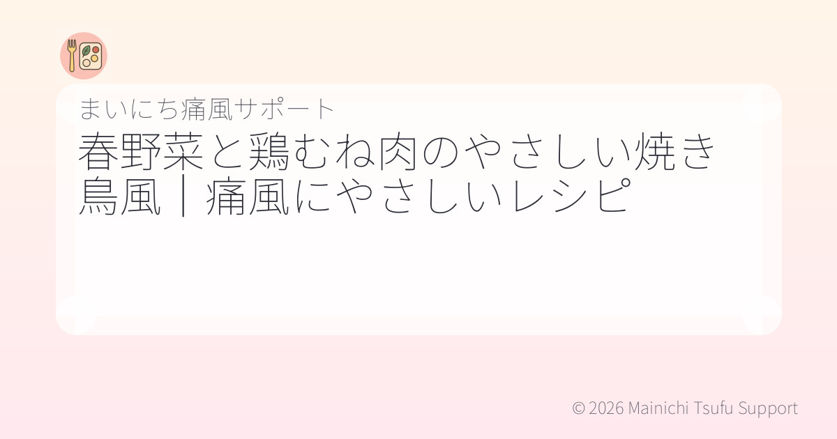 鶏むね肉は低プリン体の食材で、野菜も多く取り入れているため、痛風に配慮したレシピです。