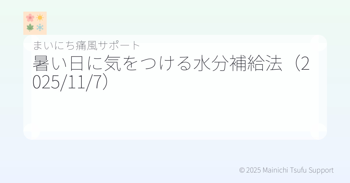 夏の暑い日、特に気温が高くなると、体は脱水症状を起こしやすくなります。痛風を抱えるご主人にとって、適切な水分補給はとても大切です。脱水は血液中の尿酸濃度を上昇させ、痛風発作のリスクを高めるため、日常の水分摂取を見直す良い機会です。