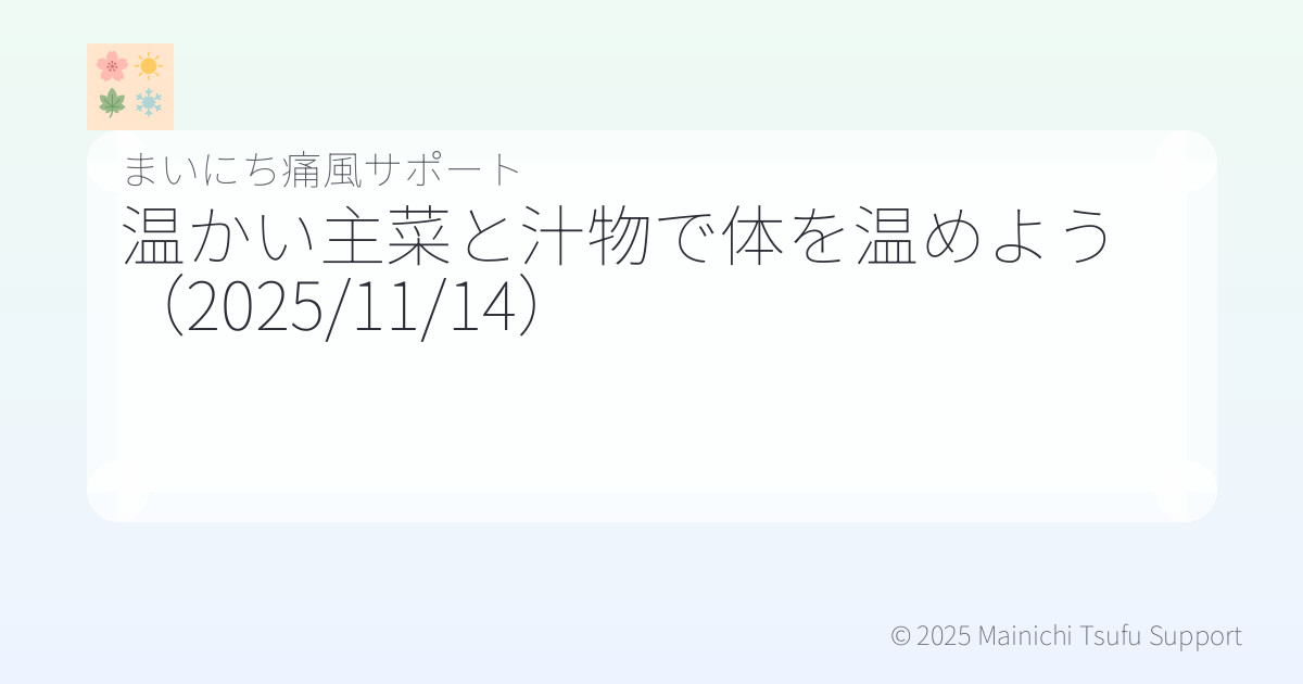寒い季節がやってくると、体温を保つために温かい食事が恋しくなります。特に痛風を持つ夫のためには、栄養バランスを考えた温かい主菜と汁物が大切です。体を温める食材を使った料理は、満足感も得られ、心身の健康に貢献します。
